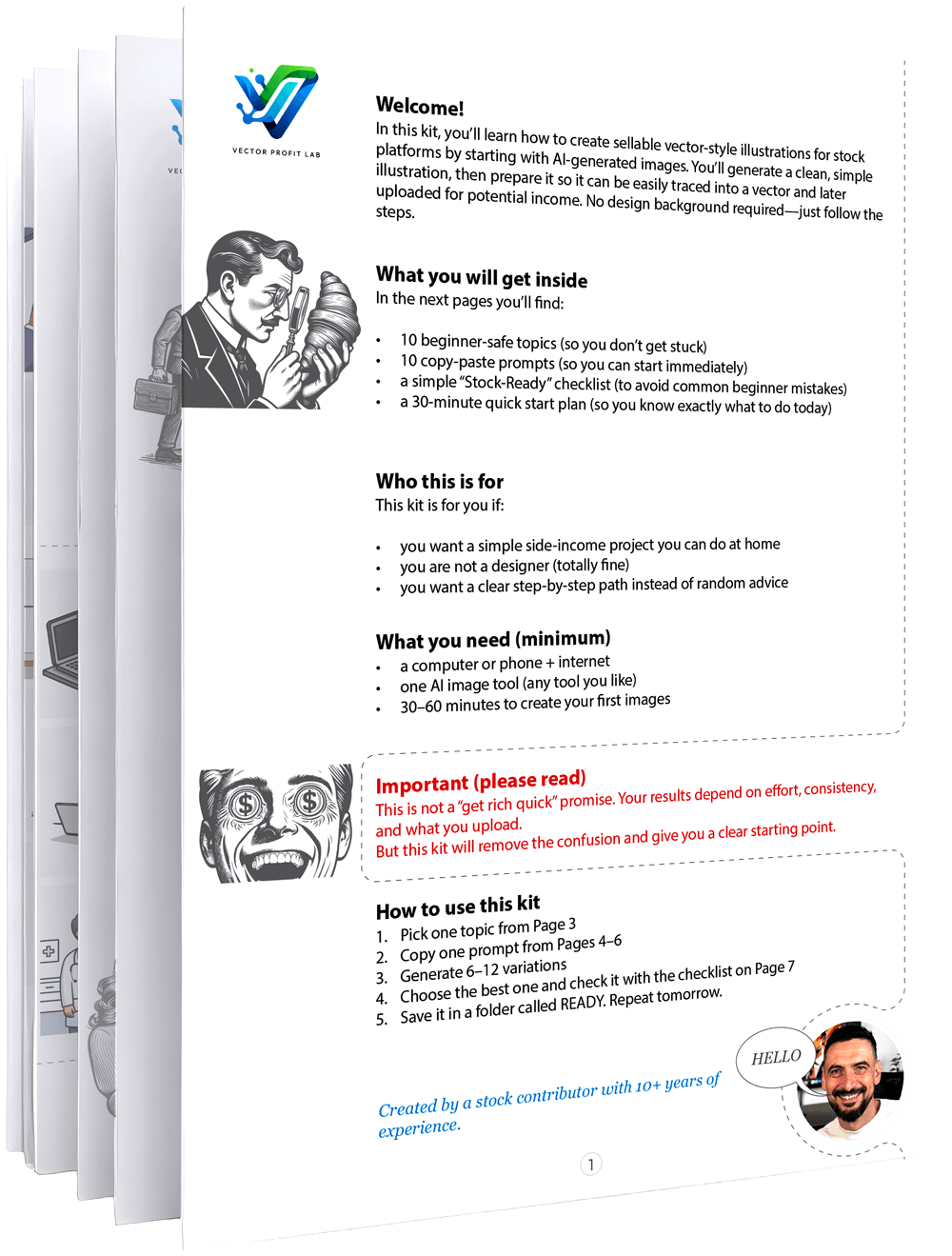 Download this free step-by-step guide to discover how to create clean, vector-style illustrations for stock platforms using AI. Build a new side-income stream: no drawing experience required!